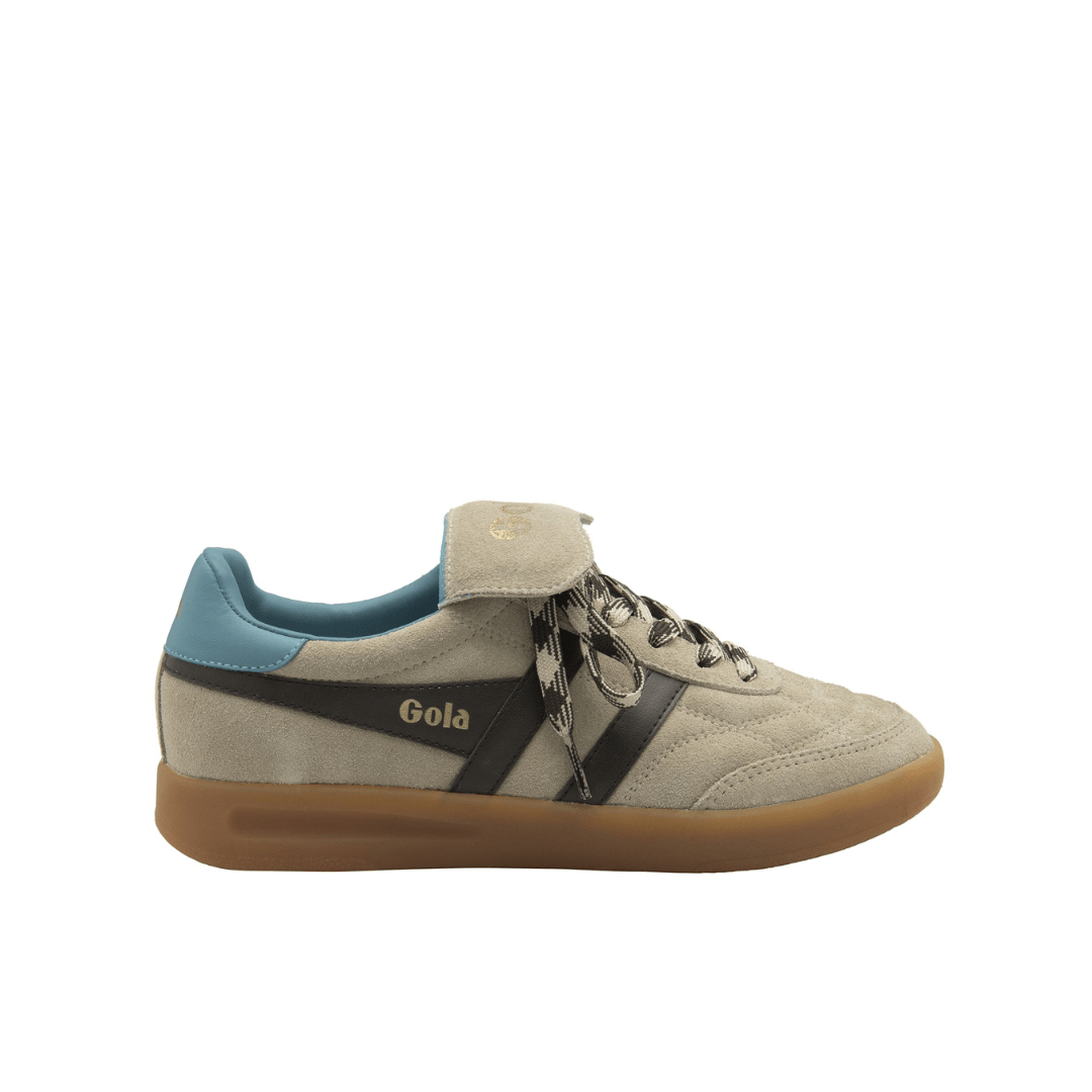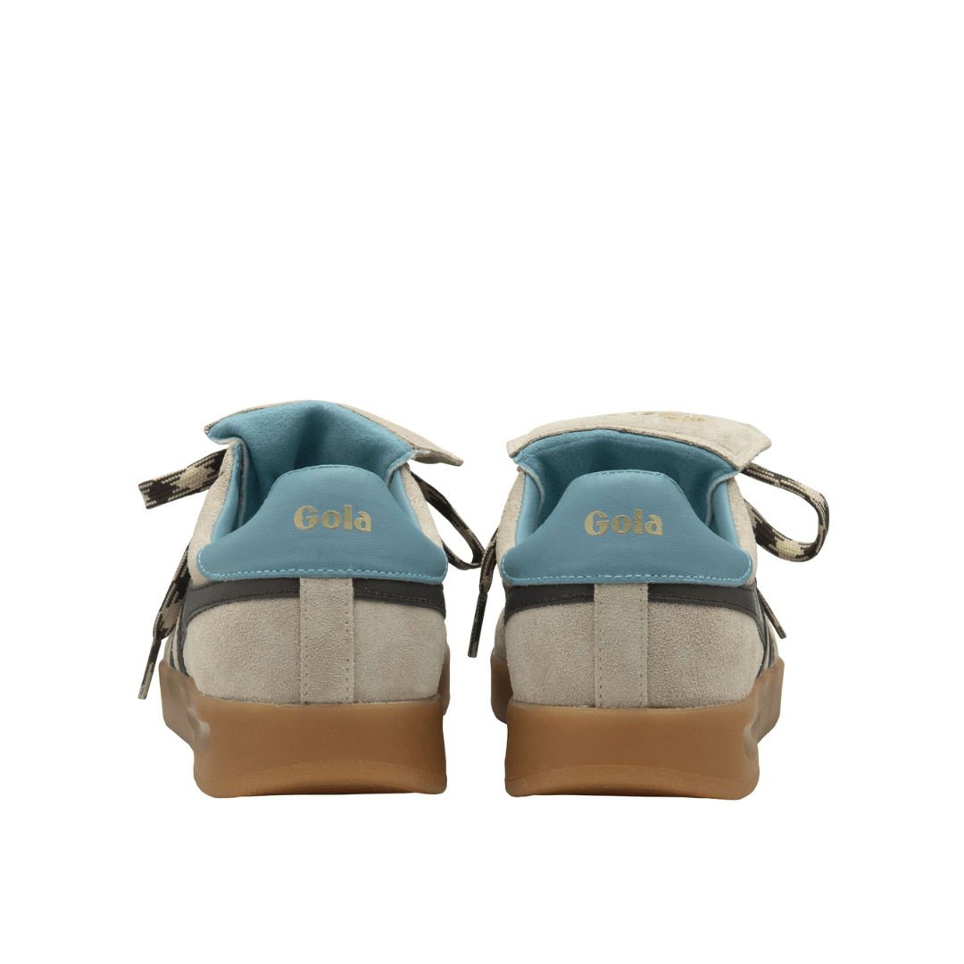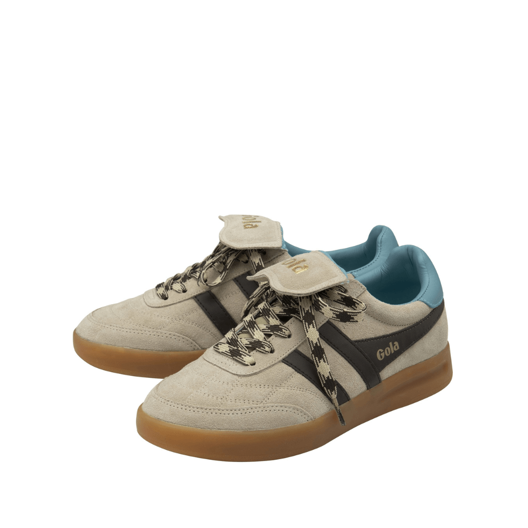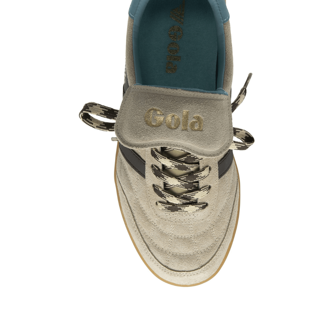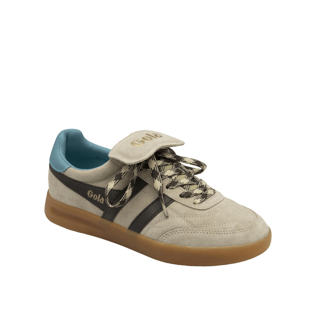 O Stadia ’86 feminino faz referência à herança de Gola com uma silhueta de futebol vintage e uma sola de goma, cabedal de camurça óssea e cadarços xadrez. Um acabamento de wingflash mocha exclusivo e uma aba azul oceano são complementados com uma língua dobrável neste novo tênis feminino AW da Gola.
