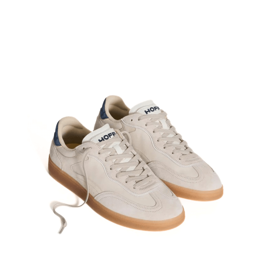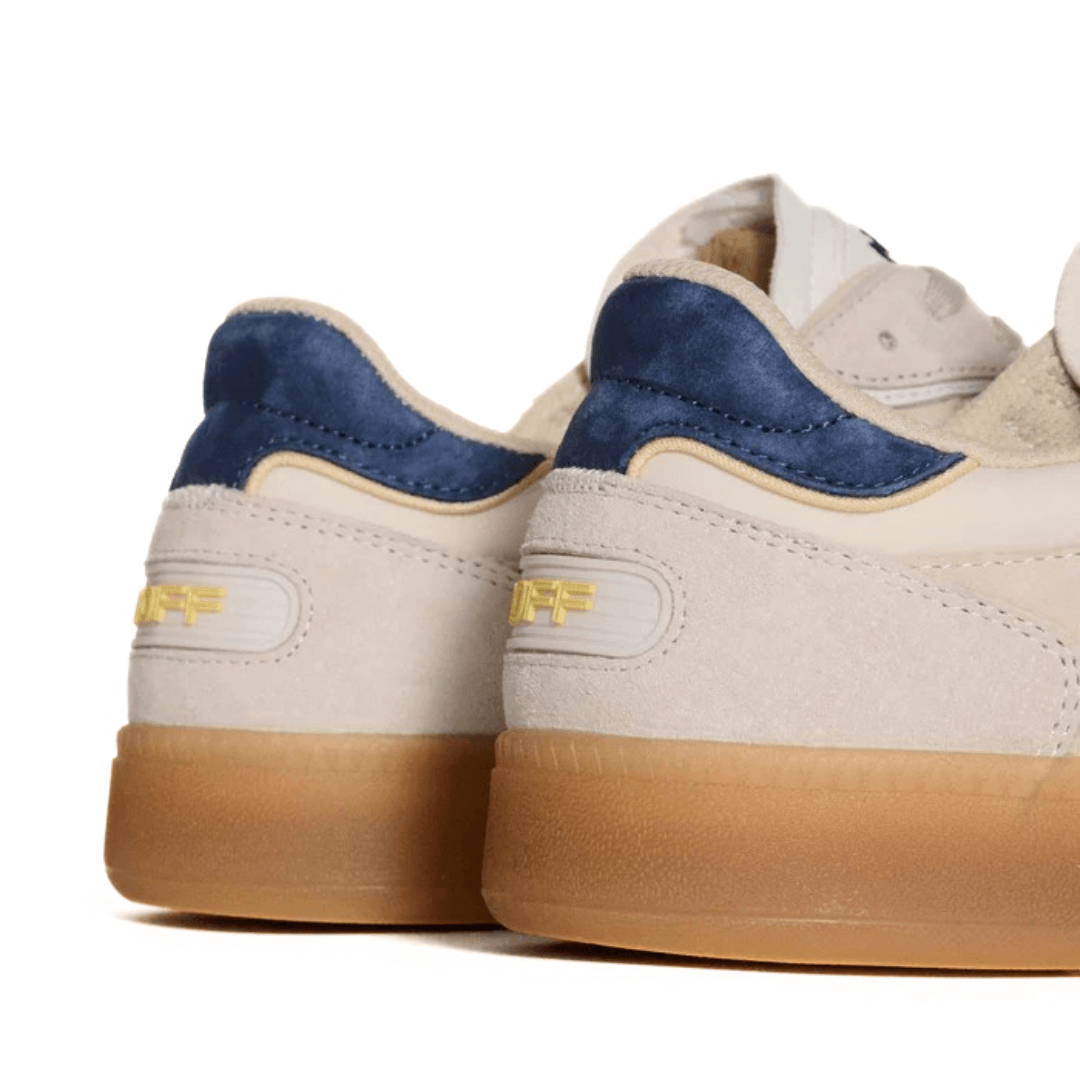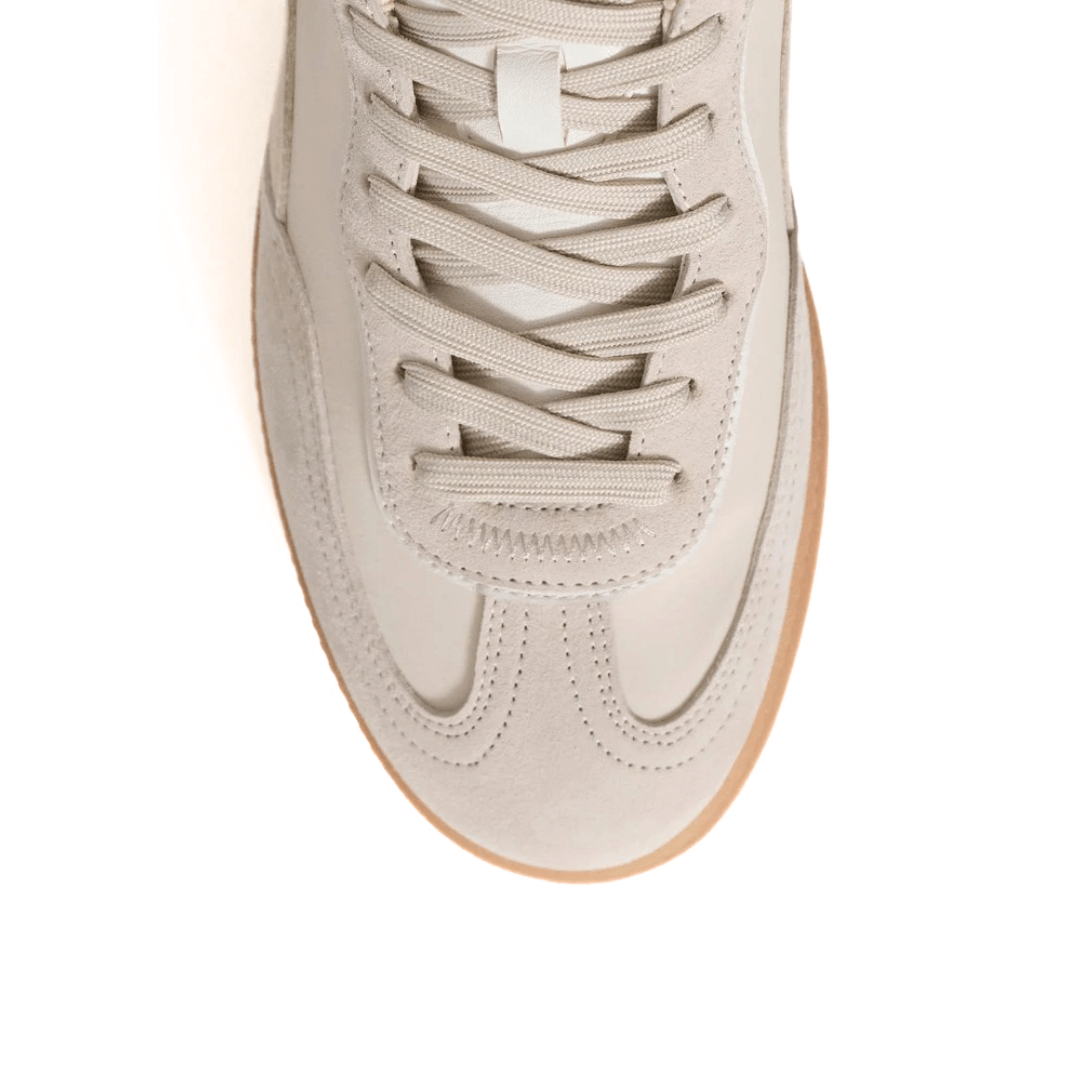 Tênis em combinação de materiais e cores. Detalhe do logotipo na parte traseira. Fecho com cadarço.
